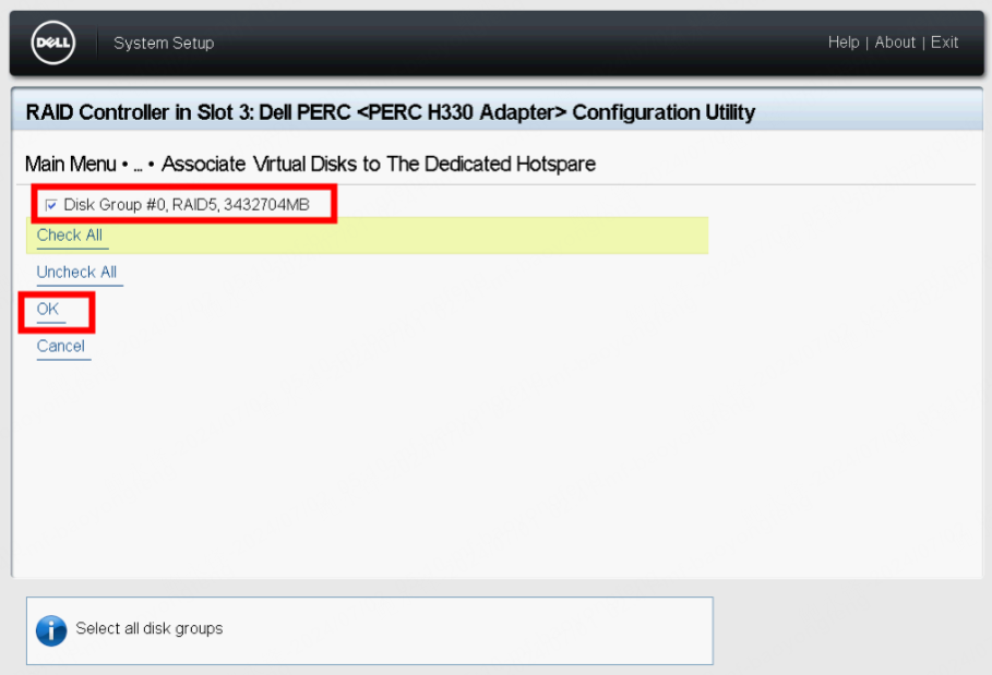 选择【Assign Dedicated Hot Spare】,此选项为将物理硬盘设置为特定RAID的热备盘。