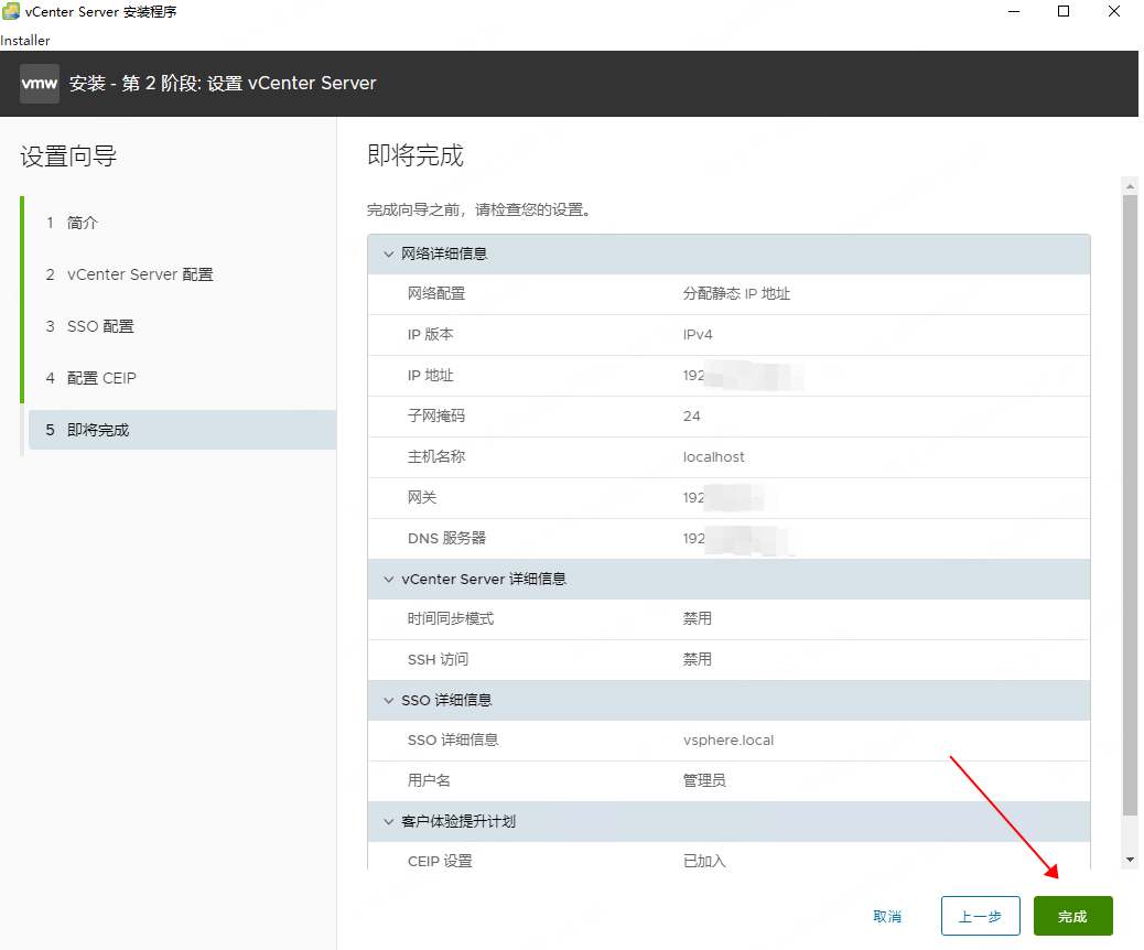 4)设置完毕后直接到第二阶段最后设置,点击【完成】后将完成vCenter Server虚拟机最后配置。