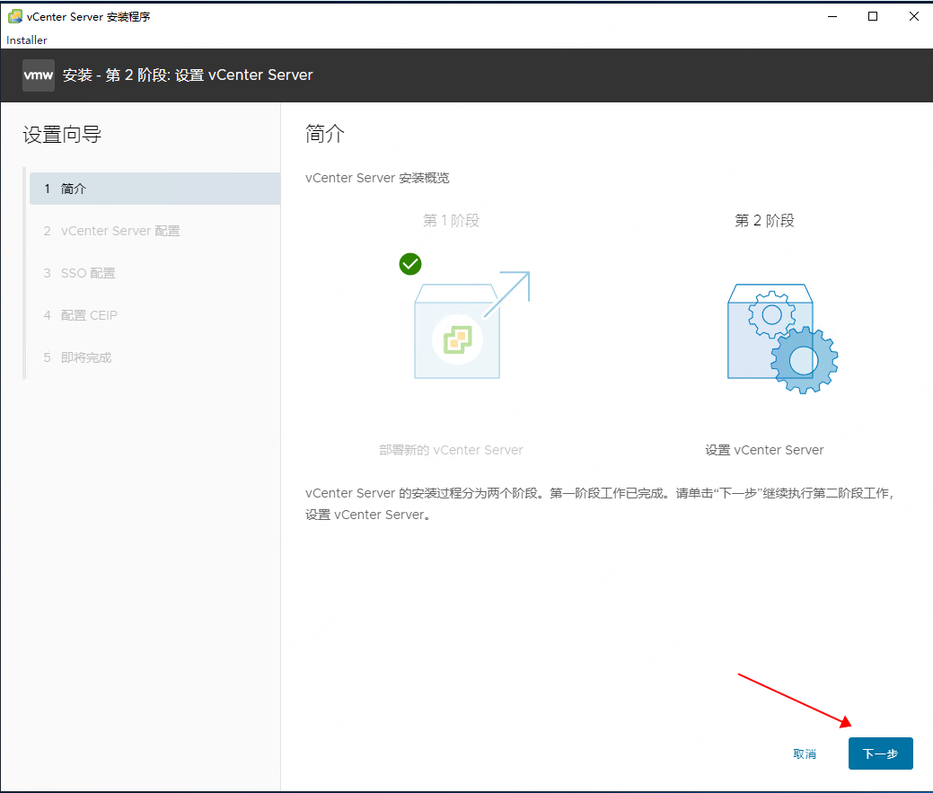 1)整个安装方式分为两个阶段,第一阶段为部署vCenter Server,第二阶段为配置vCenter Server。本次实验使用Windows 环境安装。所以安装时选择双击【E:\vcsa-ui-installer\win32\installer.exe】;