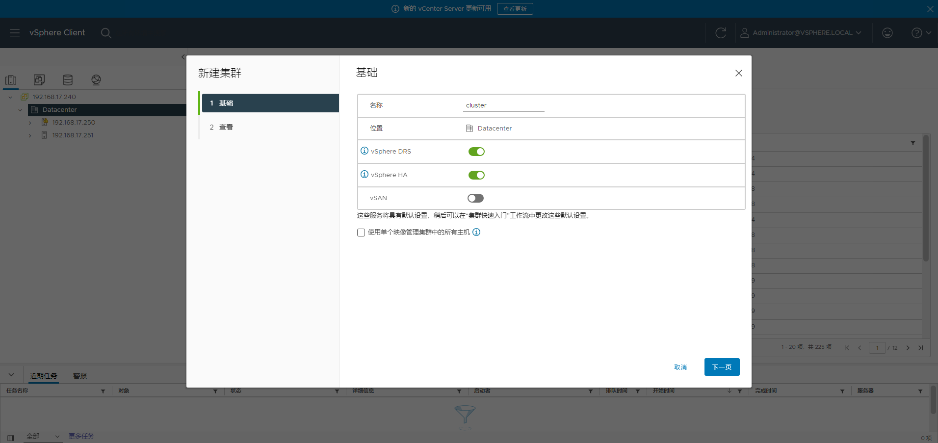 1)在XXX中右键数据中心,在【新建集群】的【名称】输入自定义名称,选择vSphere DRS及vSphere HA;