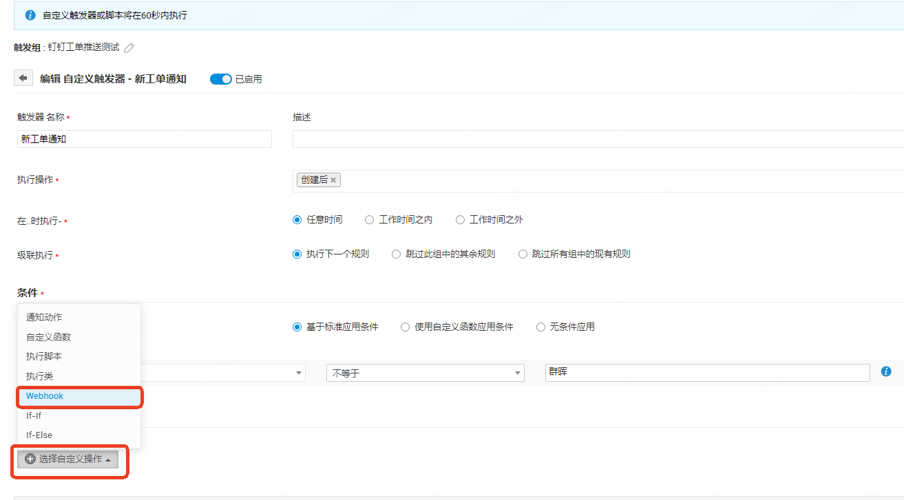 此处可根据实际需求进行配置,【动作】选择【webhook】,此处选择上述创建的webhook.由于此处为测试,基本配置如下: