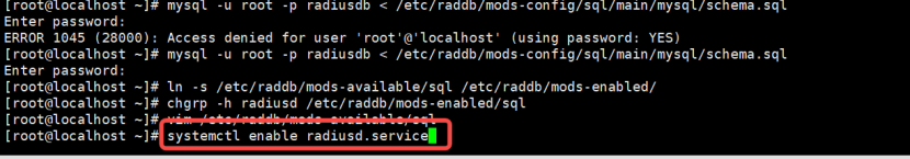 [root@loaclhost~]# mysql -u root -p radiusdb < /etc/raddb/mods-config/sql/main/mysql/schema.sql /*输入数据库密码*/
