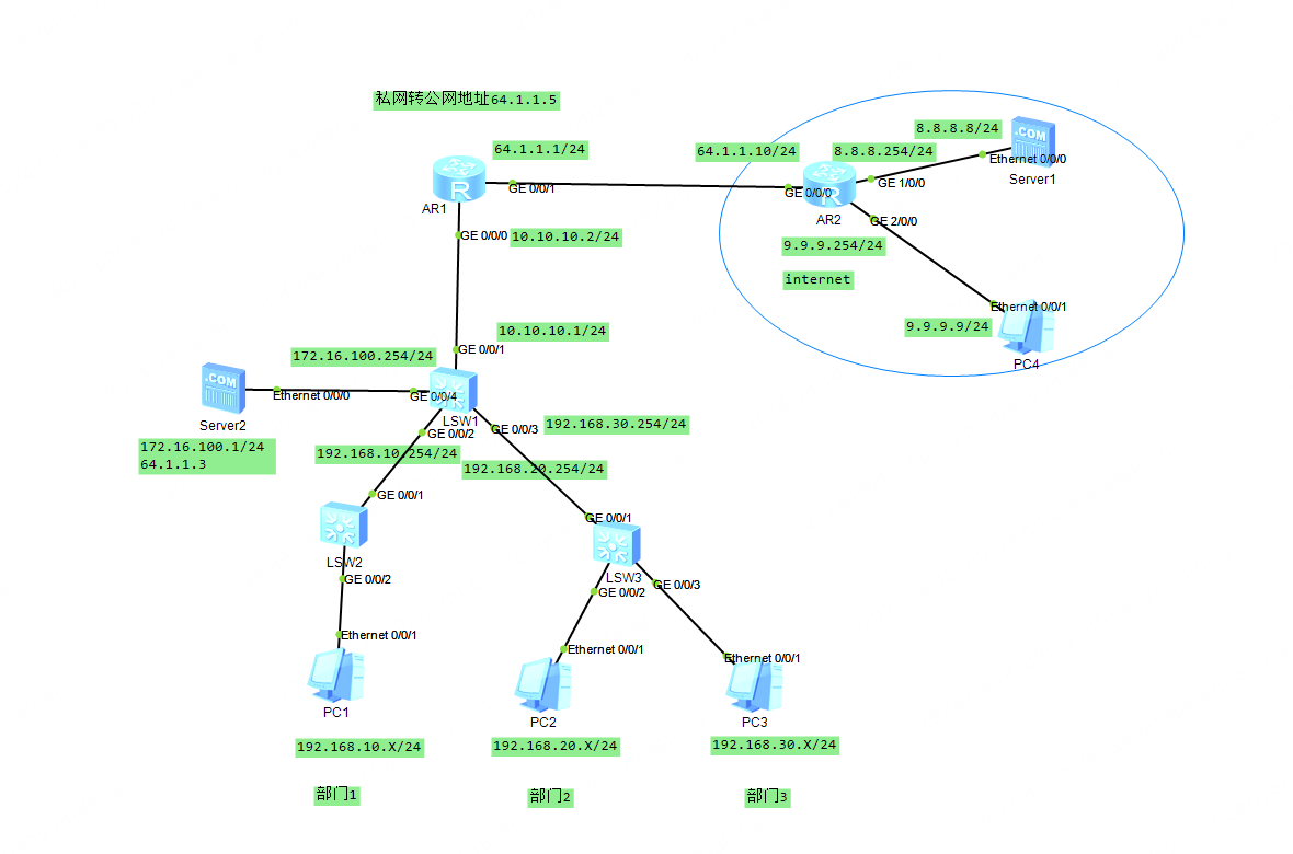 SW1为核心交换机,此处有三个部门和一台服务器,内网需划分4个VLAN,因交换机无法单独配置IP地址,所以对接到AR1的端口需设置为access接口并使用VLANIF绑定。各个VLAN分配IP地址,充当网关使用。因为部门2,部门3访问Internet,则需使用NAT将内网IP地址转换为外网IP地址。部门1设备无法访问Internet,则需要使用ACL进行控制流量。由于服务器需固定一个公网IP地址,则使用静态NAT将私网IP转换为固定IP地址。全部设备路由均由两台路由器完成。